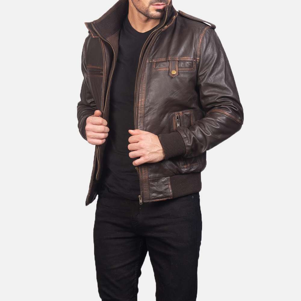 This men’s leather jacket is made of real goatskin leather with a rub-off finish. It features a quilted viscose lining, zipper closure, and a high neck collar for added comfort and style. The rib-knit cuffs, shoulder epaulettes, and six pockets (two inside and four outside) provide functionality and flair. Finished in a classic brown color, this jacket is perfect for any occasion.